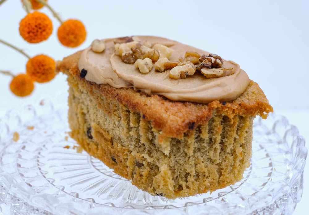 A light cake with a decent shot of espresso coffee and topped with coffee icing and chopped walnuts.